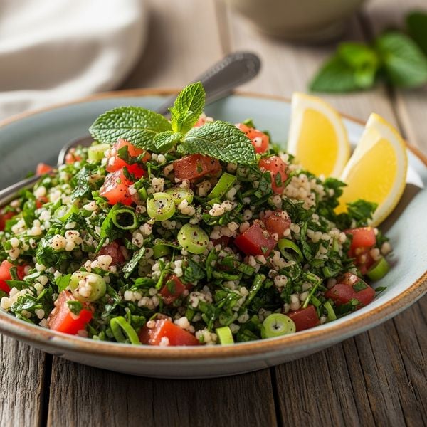 Dans un grand saladier, mélangez le boulgour égoutté, le persil, la menthe, les tomates et les oignons verts.