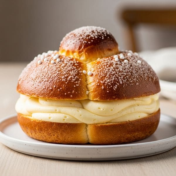 Couper la brioche refroidie horizontalement, garnir généreusement de crème mousseline puis refermer délicatement.